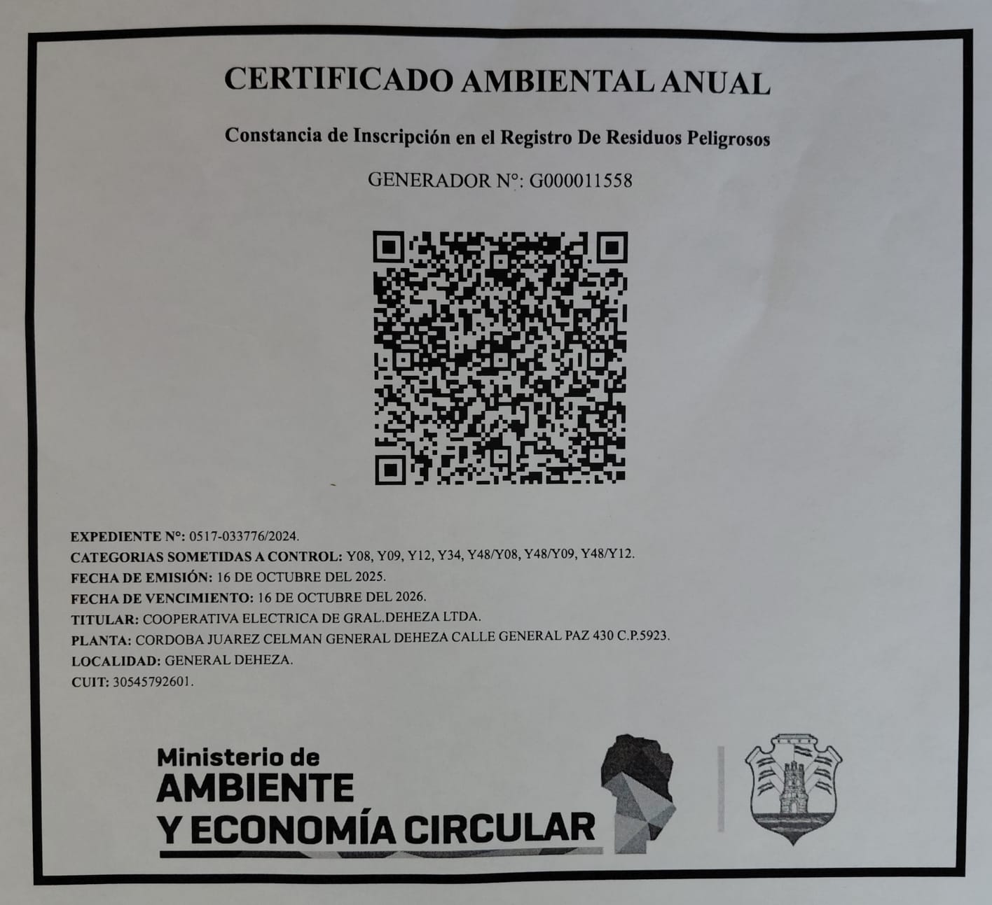 Obtuvimos el Certificado Ambiental Anual de las siguientes categorías de Residuos Peligrosos sometidos a control Y08; Y09; Y12; Y48/Y08; Y48/Y09; Y48/Y12; Y34;