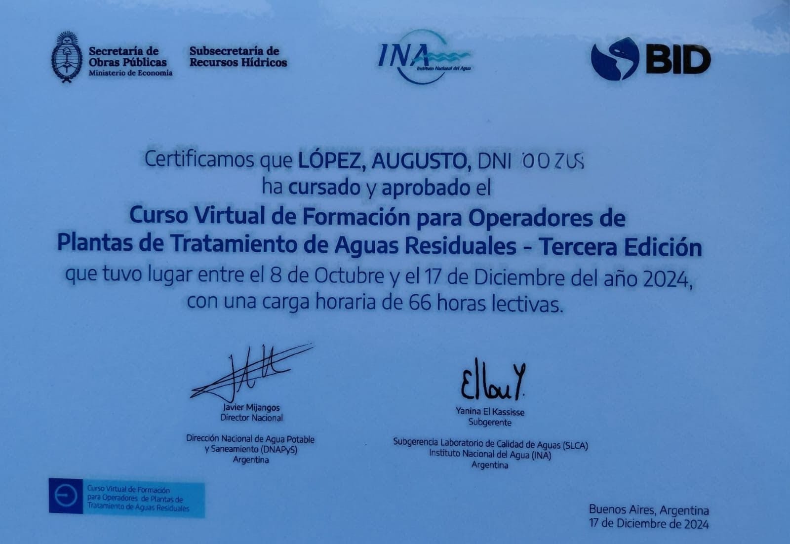 La Subsecretaría de Recursos Hídricos de la Nación, a través de la Dirección Nacional de Agua Potable y Saneamiento (DNAPyS), en conjunto con el Instituto Nacional del Agua (INA) y el Banco Interamericano de Desarrollo (BID) nos certificó al encargado y a un operario de la planta de tratamientos como OPERADORES DE PLANTAS DE TRATAMIENTO DE AGUAS RESIDUALES DE ORIGEN DOMICILIARIO.